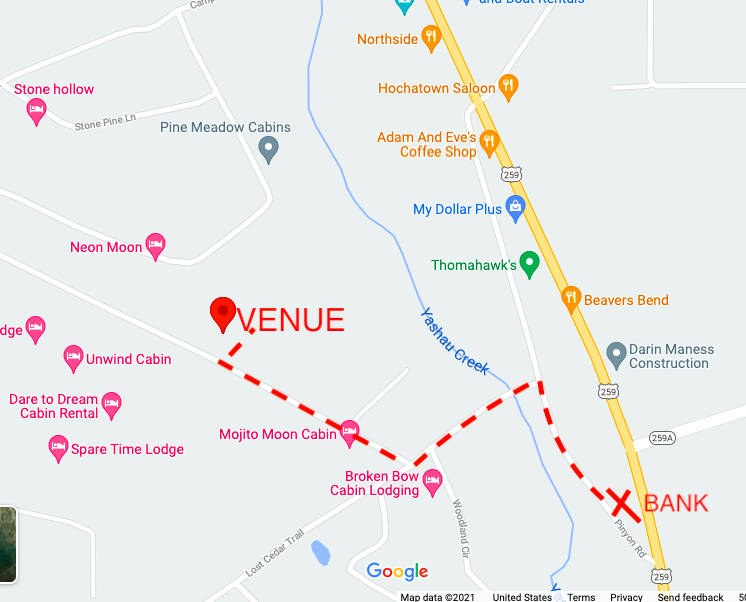The venue is on the south side of Hochatown which is approx. 8 miles north of Broken Bow, Oklahoma. There are multiple cabin options around the Hochatown/Broken Bow area as well as hotels.